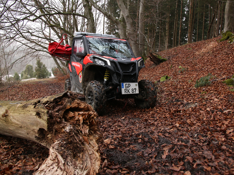 Im Vorfeld haben er und seine Mitstreiter lange überlegt, ob sie sich für ein Quad oder ein ATV als Einsatzfahrzeug im Gelände entscheiden sollen. Die Entscheidung fiel schließlich für das „Side-by-Side“-Modell, wie das ATV im Fachjargon genannt wird. „Es hat die bessere Straßenlage und lässt sich viel leichter fahren“, begründet Schneider. Zudem ist es sicherer. „Dank der Vierpunkt-Gurte und den Überrollbügeln, dem festen Dach und der Frontscheibe müssen wir keine Sturzhelme tragen.“