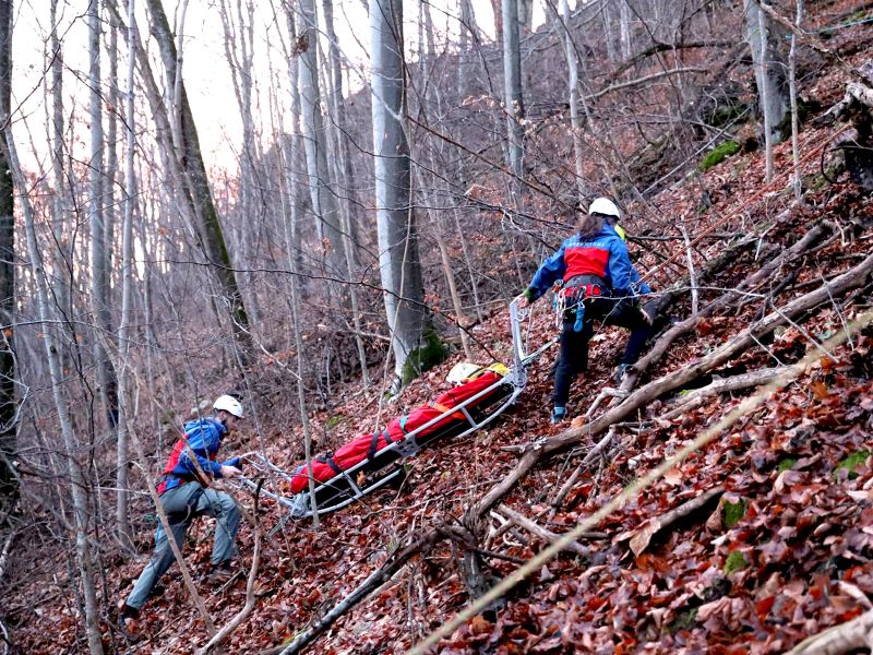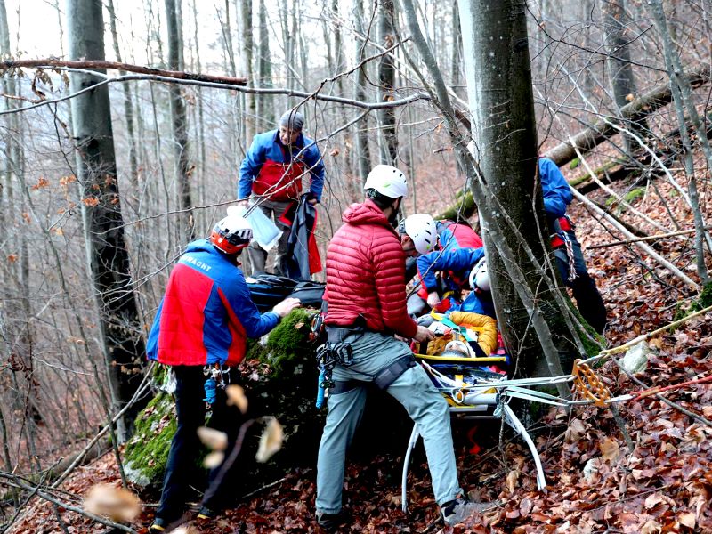 In mehreren Gruppen wurden die Patienten professionell versorgt, stabilisiert und anschließend sicher abtransportiert. Bei der Versorgung im unwegsamen und teilweise felsdurchsetzten Gelände müssen die Bergretterinnen und Bergretter nicht nur die medizinischen Punkte beachten, sondern auch die Sicherungstechnik vollumfänglich anwenden. Die Patienten wurden jeweils mit der Gebirgstrage, gesichtert durch das Statikseilsystem, schonend und sicher aus dem Gelände abtransportiert.